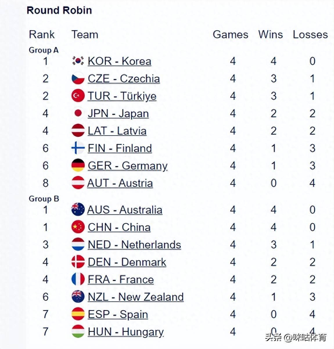 四轮小组赛战罢,中国队与澳大利亚队均以四战全胜的不败战绩领跑 B 组,两组之间的直接对话将大概率决定小组头名归属;A 组则呈现韩国队一枝独秀的格局,他们同样豪取四连胜,提前锁定小组出线主动权。