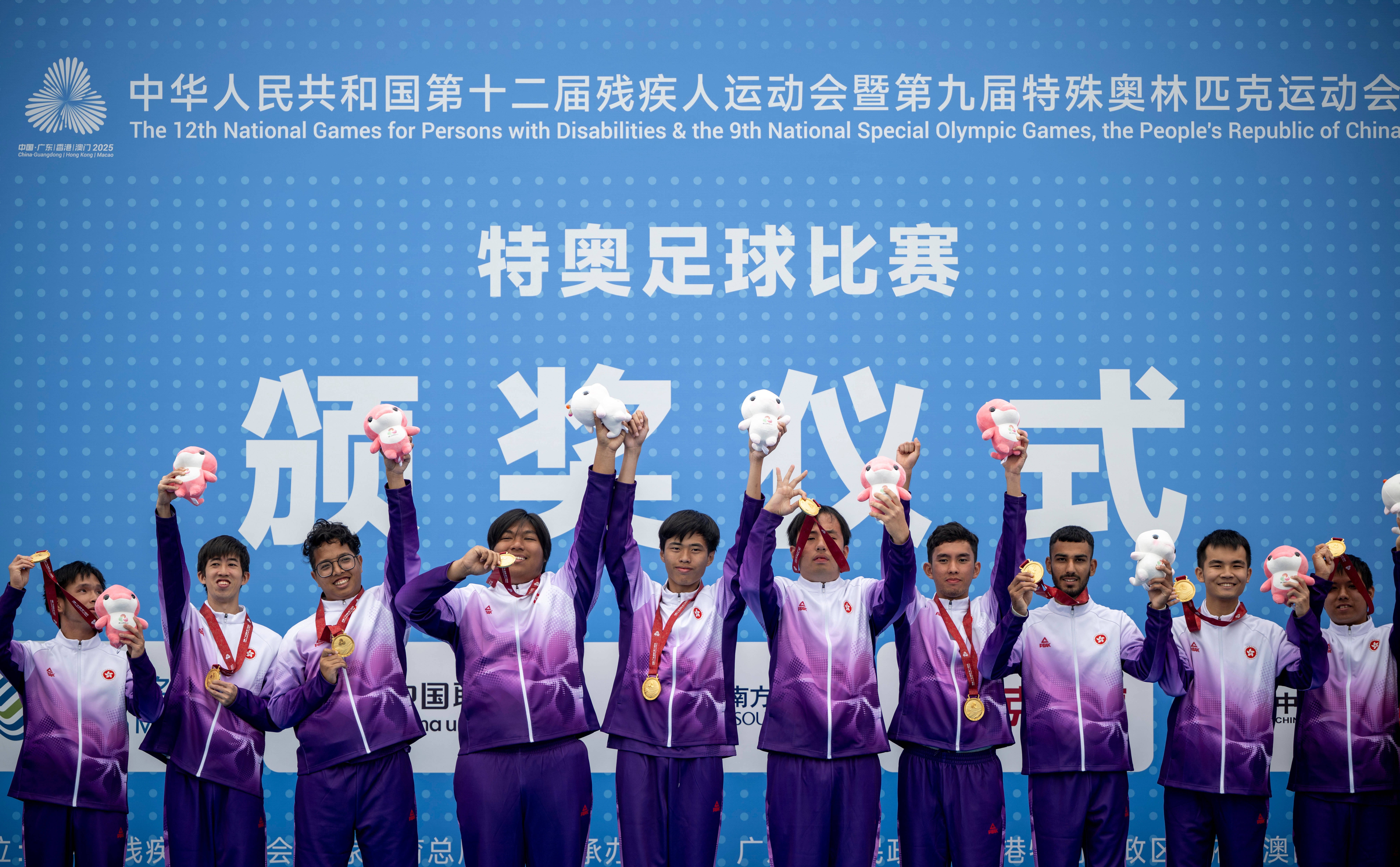 12月15日,香港一团队获得特奥足球队制比赛A组冠军。新华社记者 隋尚君 摄李家超说,香港代表团以历来最大规模参加本届残特奥会,充分发挥个人毅力和团队精神,创造历史佳绩,在赛事中取得51金49银40铜,成绩令人鼓舞。运动员奋力拼搏、克服障碍、超越自我,展现香港永不言败、坚毅不屈的精神。